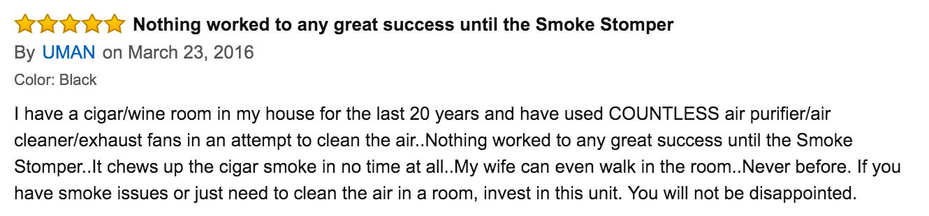 Whether you smoke Cigars or Cigarettes, our industry leading Smoke Stomper Home Smoke Eater is guaranteed to get the smoke out. Stop wasting your money on air purifiers that have no chance of handling tobacco smoke. Our Smoke Stomper Home Smoke Eater is made in the same production facility where all of our commercial smoke removal equipment is made.