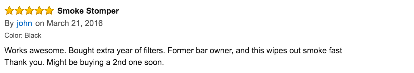 Guarantee: We are offering a crazy unconditional 90 day money back guarantee on your new Smoke Stomper Home Smoke Eater. You will know within a few days whether or not you are happy with the results, but you will have a full 90 days to try it out.
